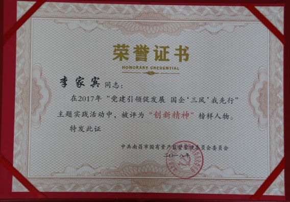 在2017年度国资委组织的“党建引领促发展 国企“三风”我先行”主题实践活动中,陈国明同志被评为“优秀工作者”,李家兵同志被评为“创新精神”榜样人物,徐棽同志被评为“工匠精神”榜样人物。